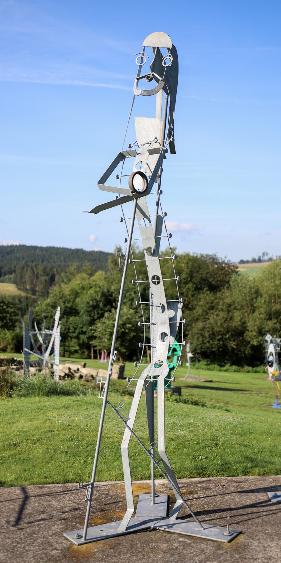 Die Menschen leben als Männer und Frauen untereinander und zusammen. Trotz vieler körperlicher Ähnlichkeiten gibt es doch bedeutende anatomische und seelisch-geistige Unterschiede. Die Bezeichnungen „Mann“ und „Frau“ dienten immer auch zur gesellschaftlichen Abgrenzung beider voneinander. Die mexikanische Indianerin La Malinche war eine besonders umsichtige und starke Frau, die dem spanischen Konquistador Hernán Cortés in der Stadt des aztekischen Königs Montezuma II. 1521 den rettenden Ausweg wies und ihm und seinen Truppen auch später mehrfach das Leben rettete. Später hat Cortes sie, obschon Indianerin, geheiratet und ein Kind mit ihr gezeugt. Malinche gehörte einem anderen Indianerstamm als den von Cortez besiegten Azteken an. Ihr Stamm hasste die Azteken, die vor Menschenopfern und Kannibalismus nicht zurückschreckten. Die über drei Meter hohe, schlank aufragende, aber dynamisch geschwungene, surrealistische Figur der Frau Malinche verbindet technisch eine Mischung aus räumlicher Grafik und räumlichem Flächenspiel. Der Typ dieser Frauenskulptur von Malinche knüpft an ein virtuelles Verständnis von Frauen und auch an surrealistische Gestaltbilder von Salvador Dalí. Malinsches Kopf einer eindrucksvollen Frau ist fast der Kopf einer Walküre oder einer Kriegerin mit Seitenlocken und nach hinten herabziehenden, geschwungenen Haaren. An dem runden spiegelförmigen Zepter ihres Stempelstabs in der rechten Hand laufen die „Atmakoms“ hinauf, welche in meiner Symbolik die Seelenbegleiter ins Jenseits sind.